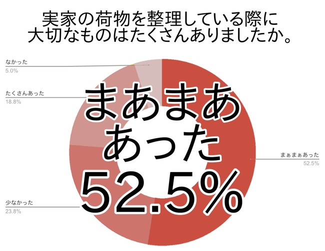約半数の52.5%が「まあまああった」と答えました。「たくさんあった(18.8%)」と合わせると約7割(71.3%)は、少なくともある程度の量のものを大切なものと感じ保管を選んだことになります。