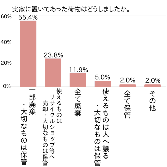 一番多かったのは「一部廃棄・大切なものは保管(55.4%)」でした。物の劣化や整理量の多さから不用になったものは処分と結論づけられることが多い傾向でした。