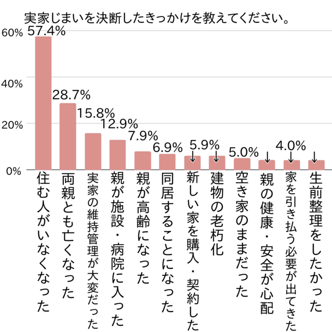 両親や祖父母が暮らしてきた家・自分が育ってきた家を自らの手で処分することになる実家じまい…実作業だけでなく、精神的にも重い決断になることが多いのではないでしょうか。そんな大きな決断のきっかけとなったのは何だったのでしょうか。アンケートで回答者の経験について尋ねました。