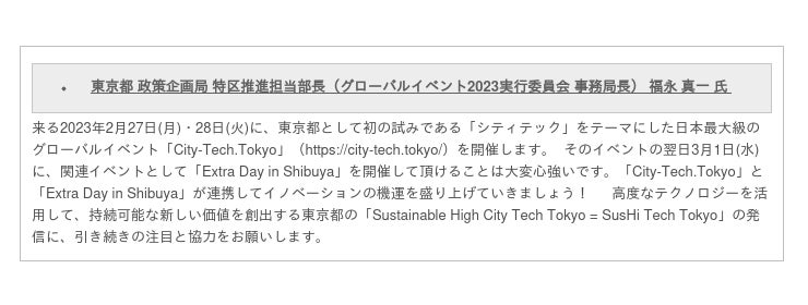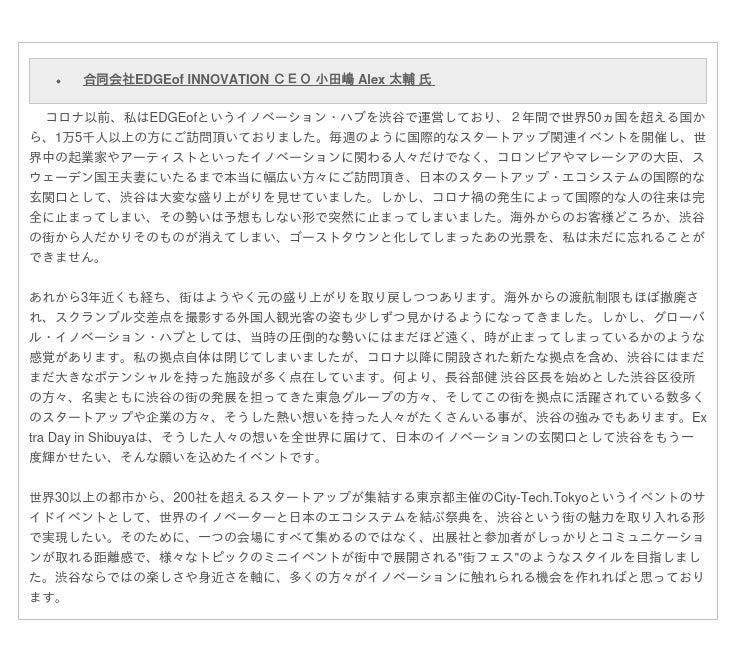 合同会社EDGEof INNOVATION(本社:東京都渋谷区、CEO:小田嶋 Alex 太輔)および 、一般社団法人交通都市型まちづくり研究所(所在地:東京都品川区、代表理事:漆畑 慶将)は、Extra Day in Shibuya実行委員会の事務局として、2023年3月1日に東京都渋谷区内の複数拠点において、「Extra Day in Shibuya」を初開催いたします。これは、2023年2月27日~28日にかけて東京都などが実施する「City-Tech.Tokyo」の正式なサイドイベントとして実施する、都市型フェスティバル形式のイベントとなります。