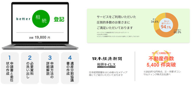 2015年の相続税法改正により、相続税申告の対象者が大幅に増加し、できるだけ税理士報酬を抑えて自分で相続税申告を行いたい方が増えました。このような背景から、2020年に「自分でできる相続税申告 better相続申告(https://jp-better.com/lp/shinkoku/)」を提供開始しました。また、2021年には、「自分でできる相続登記 better相続登記(https://jp-better.com/lp/touki/)」を提供開始しています。2024年4月には、相続登記の義務化が予定され、相続登記を必要とする方が大幅に増える見込みです。better相続の利用者の平均年齢は54歳で、相続手続きが発生する世代の方に幅広くご利用いただいています。