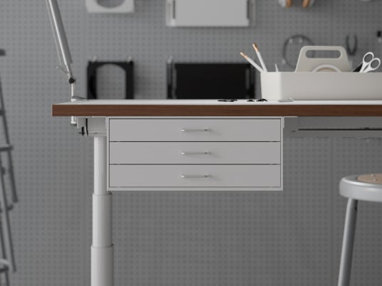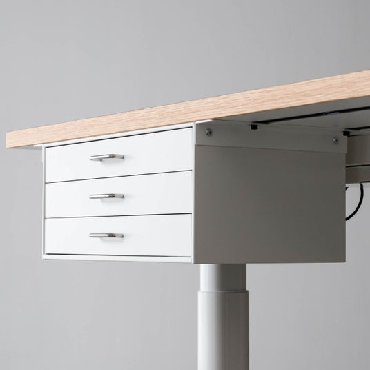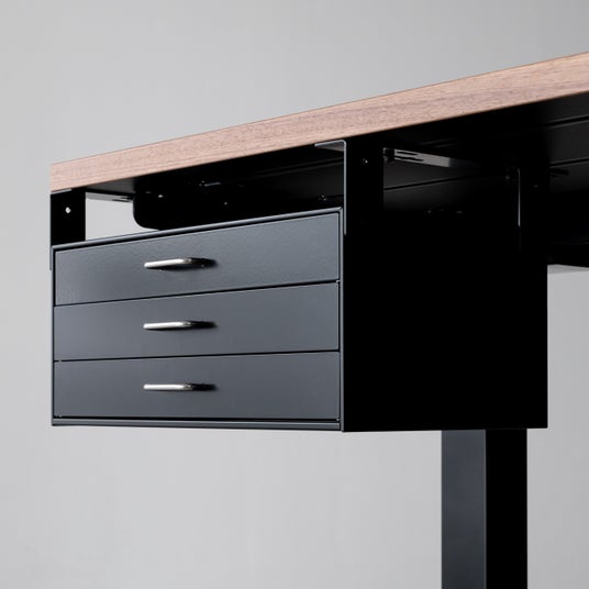3段の引き出しを備えた『Drawer Three』。文具や工具類などを数多く必要とする作業はもちろん、A4クリアファイルも収まるので紙類の多いワークスタイルにもマッチ。デスクの収納力を大きく向上してくれるモジュールです。