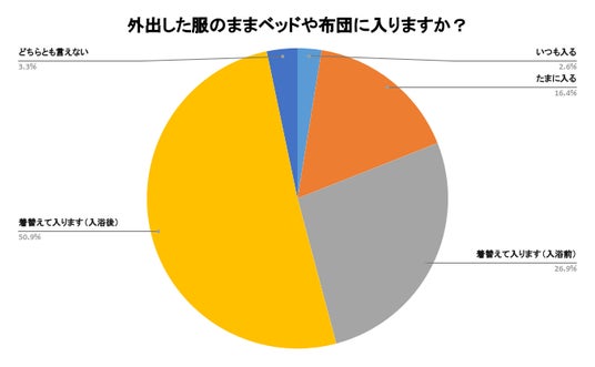 - 外出した服のままベッドや布団に入るか?には「着替えて入る(入浴後)」が最も多く全体の50.9%