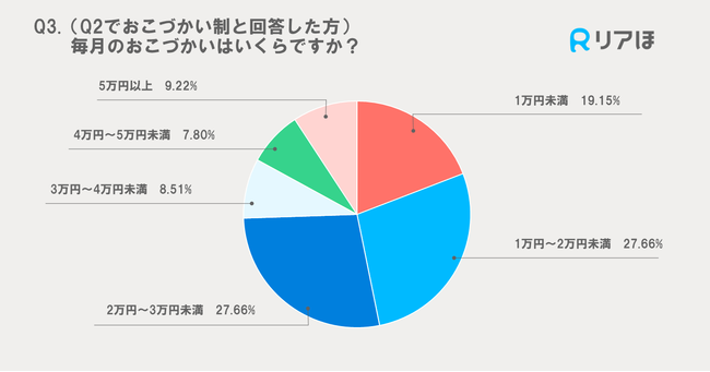 Q2でおこづかい制と回答した男女に、毎月のおこづかい金額を質問したところ、「1万円~2万円未満」「2万円~3万円未満」が同率で27.66%、次いで「1万円未満」が19.15%となりました。