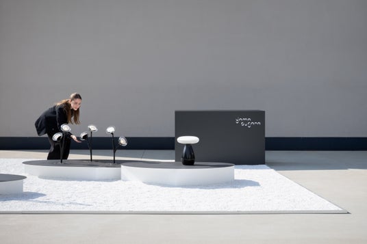 展示会場のレオナルド・ダ・ヴィンチ記念国立科学技術博物館「Cavallerizze(カヴァッレリッツェ)」には、白い砂利の上に黒い楕円状のプレートを点在させ、各製品をランダムに配置することで、人工的ではない自然なリズムを感じさせる空間を作り上げました。白と黒のモノトーンに絞ったシンプルな展示デザインにより、『yomosugara』の有機的なフォルムや安らいだ灯り、日本的な精神性を印象づけることに成功しました。