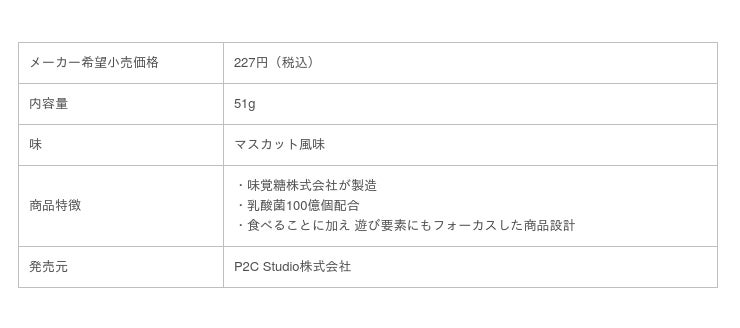 そして、製造ではお菓子メーカーの「UHA味覚糖」とタッグを組み、お菓子としてのおいしさやクオリティにもこだわった商品となっております。