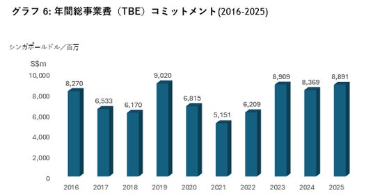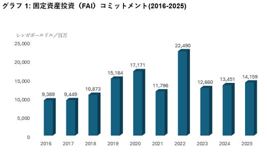 2025年の設備・インフラへの計画投資を示す固定資産投資(FAI)は総額142億シンガポールドル(以下ドル、約1兆7230億円)となりました。一方、人件費や研究開発費など、企業が事業運営のために計画する年間総事業費(TBE)は89億ドルに達しました。今後5年間でこれらの投資コミットメントが実現した場合、180億ドルの付加価値(VA)を生み出すことが見込まれています。