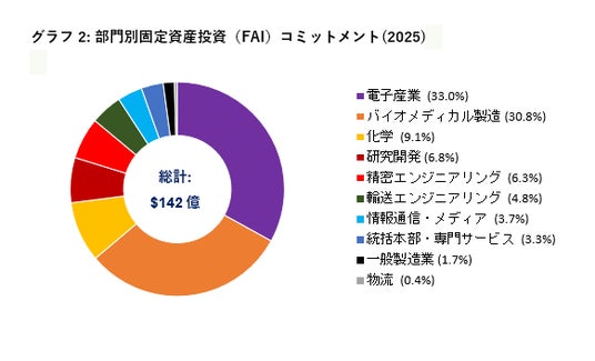 固定資産投資(FAI)コミットメント額142億ドルのうち、約121億ドルは製造業からのものでした。製造業各社は、半導体やサーバー、電気自動車、バイオ医薬品・医療機器、スペシャリティケミカル、サステナブル素材、航空宇宙保守・修理・整備(MRO)サービスへの世界的需要の高まりに対応するため、工場の新設や既存施設の拡張を行いました。