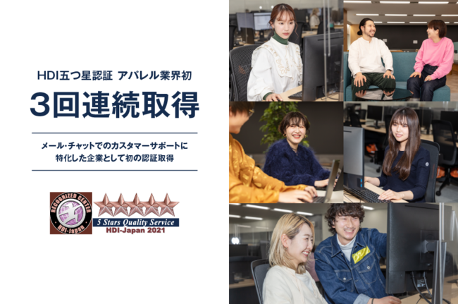 株式会社ZOZO(本社:千葉県千葉市 代表取締役社長兼CEO:澤田 宏太郎)が運営するファッション通販サイト「ZOZOTOWN」(https://zozo.jp/)のカスタマーサポートセンターは、「HDI-Japan」が提供する「HDI五つ星認証プログラム」において、最高評価である「五つ星認証」を、アパレル業界で初めて3回連続(※1)で取得いたしました。なお、メールやチャットでのテキストコミュニケーションに特化したカスタマーサポートを行う企業として、当社が初めての五つ星認証取得となりました。(※2)