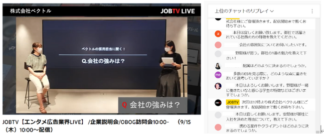 株式会社ベクトル(本社:東京都港区、代表取締役会長兼社長:西江 肇司、東証プライム:6058、以下ベクトル)が運営する動画就活のJOBTV(https://jobtv.jp)は、2023年8月3日にJOBTV掲載企業7社の社員に登壇いただき、オンライン会社説明&OBOG訪問を行う「エンタメ業界LIVE」を開催し、1500名以上の就活生を動員しました。