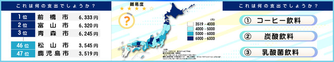 「紙川式統計クイズ」とは、主に家計調査のデータをもとに支出の状況を日本地図上に色分けし、何の品目を表しているのかといった問題を出題するクイズです。日本各地の統計情報を視覚的かつ楽しく、直感的に学ぶことができます。また全国の季節を感じる食品や、地域ならではの気候風土をうかがい知れる食品などさまざまなテーマでクイズを出題!