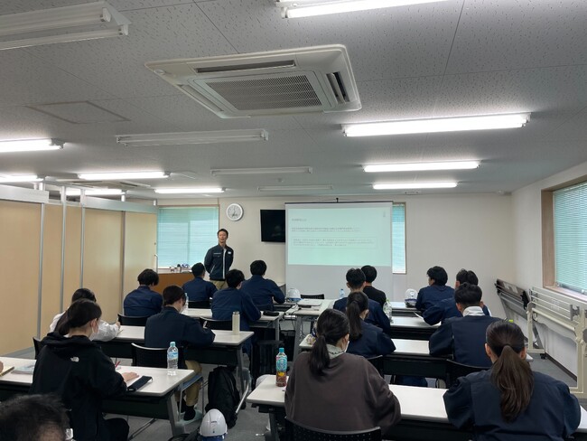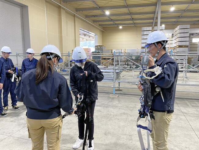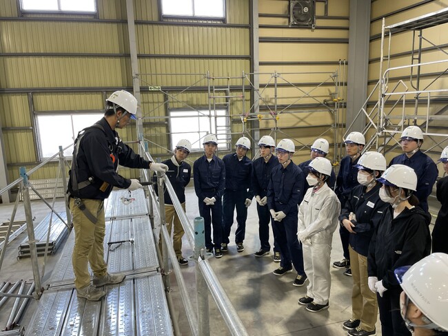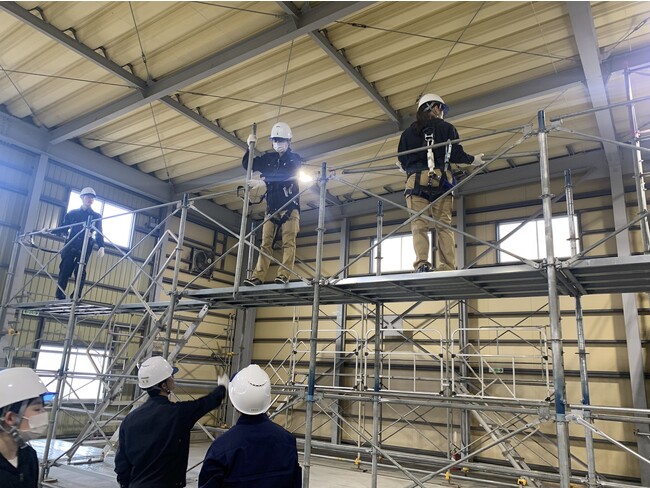 特別教育の一貫として足場の組み立てを行い、仮設機材の重量や身体への負荷を体感していただきました。また、フルハーネス着用のうえ高所での足場の組み立ても行い、高所で作業する難しさを学んでいただく機会となりました。
