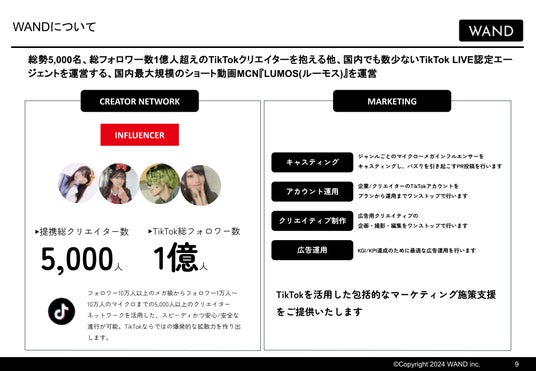 株式会社WANDは、「すべての人に、魔法の杖を。」をミッションに、約5,000人のTikTok・Shorts・Reelsクリエイターネットワーク「LUMOS(ルーモス)」・クリエイター向け案件マーケットプレイスアプリ「LUMOS BUZZ(ルーモスバズ)』・音楽業界特化型マーケティング支援を提供するインフルエンサーマーケティング企業です。