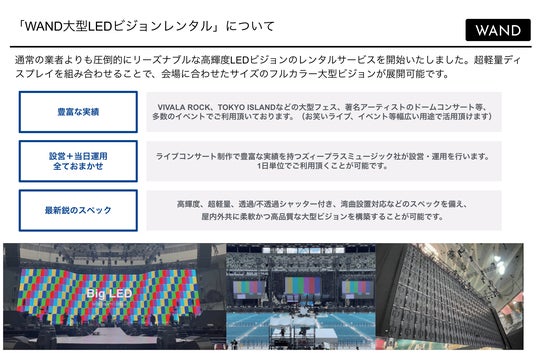 音楽・エンタメ業界特化型マーケティング支援と約5,000人のショート動画クリエイター向け企業案件プラットフォームを提供する株式会社WAND(本社:東京都渋谷区、代表取締役社長:黒崎悠一、以下「WAND」、https://thewand.jp/)は、組み立て式フルカラー大型LEDビジョンのレンタルサービスを開始しました。
