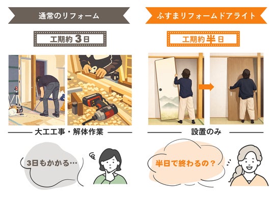 大工工事や解体作業には約3日かかりますが、ふすまリフォームドアライトなら、工期は半日!工期をグッと節約できます。