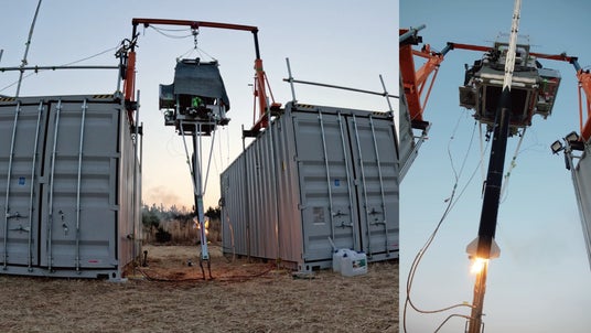 今回の実験では、空中における気球環境を地上で模擬するため、2基のコンテナ上に門型ゲートを設置し、CMG姿勢制御装置およびロケットを吊り下げた状態で推力300N級小型ロケットKogitsuneの発射実験を行いました。本実験においては風などの外乱が加わる条件下で制御を行いながら一連の発射挙動の検証を行っています。