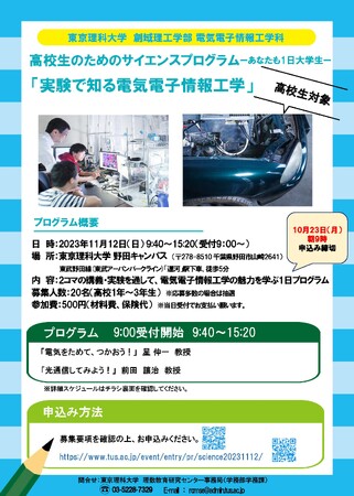 東京理科大学理数教育研究センターでは、野田キャンパス(千葉県野田市)にて11月12日(日)に高校生に大学の教育・研究の一部を体感してもらうプログラムを開催します。ぜひご参加ください