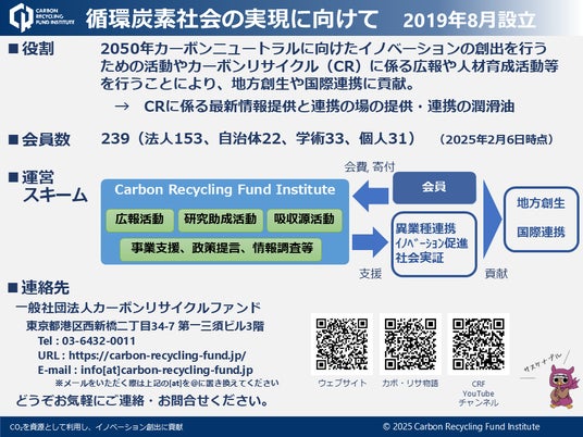一般社団法人カーボンリサイクルファンド(CRF)は、循環炭素社会実現を目指し、カーボンリサイクルを新たな成長産業に育成し、地方創生や国際連携に貢献すべく取り組んでいる会員数230以上で構成される業種横断的な団体です。