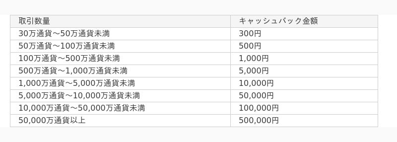 キャンペーン期間中に以下の条件を満たすFX取引を行った場合、取引数量に応じて取引口座に現金をキャッシュバックします。