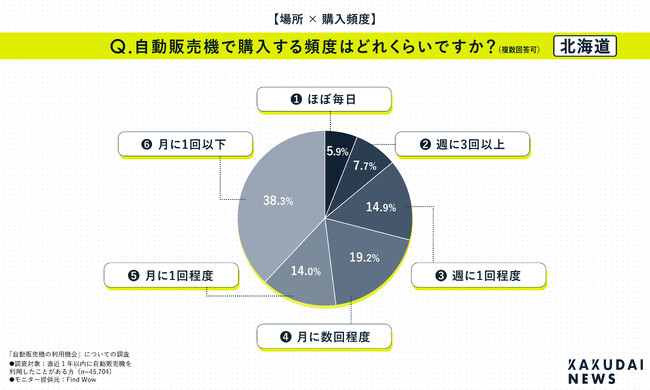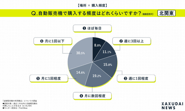 また興味深いのは、『月に数回程度』から『月に1回以下』では60.9%と、北海道に比べ11%も少ない結果となり、都心地での自動販売機の台数、生活環境などの違いから、自販機に接触する機会が多いのかもしれません。