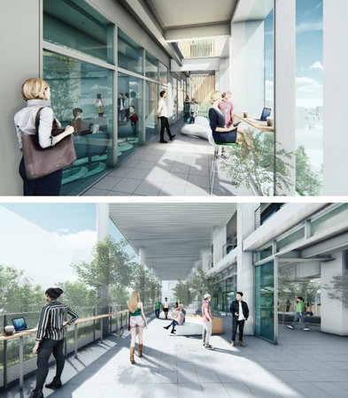 環境性能の向上に大きく寄与する「ケヤキテラ ス・モクテラス」は、入居テナントや地域の方々の ための交流スペースとして機能します。