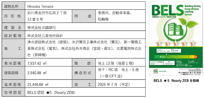 株式会社北國フィナンシャルホールディングス、株式会社三菱地所設計は、2025 年 7 月の竣工を目指し、 石川県金沢市にて建設が進むオフィスビル「Hirooka Terrace」(以下、本施設)が、建築物省エネ法に基づく第三者認証制度である「BELS」認定の最高評価(5つ星)ならびに「Nearly ZEB」を取得しました。