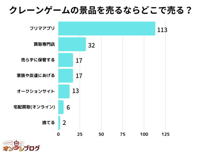 「クレーンゲームの景品を売るならどこで売りますか?」アンケート調査した結果、1位は『フリマアプリ』でした。
