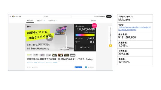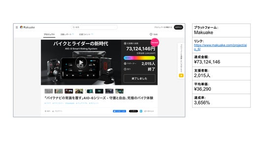 2位から5位までをMakuakeのプロジェクトが独占したことは、同プラットフォームの戦略の安定性と再現性の高さが見受けられる。これらのプロジェクトは、財布、スマートモニター、薄型財布、バイクナビと多岐にわたるが、「革新的でデザイン性の高い消費者向けプロダクト」という共通点で括ることができる。これら4つのプロジェクトの成功は、GREEN FUNDINGのように単一のメガヒットに依存するのではなく、多様なジャンルで一貫してヒットを生み出すMakuakeのエコシステムの強さを示している。市場投入前の完成度の高い製品を魅力的に見せ、購買意欲の高い顧客層に届けるという「型」が確立されている。