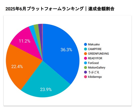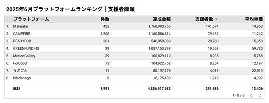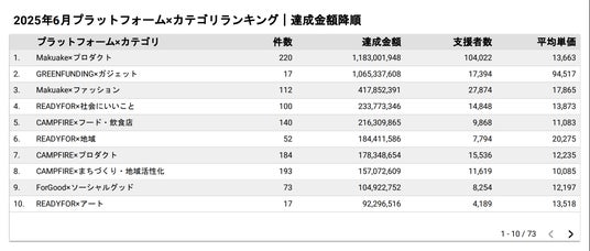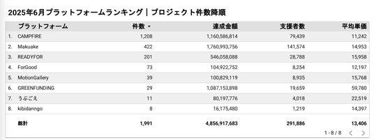 2025年6月に実施されたクラウドファンディングの達成金額ランキングTOP5では、支援額・支援者数・平均単価・達成率の各データが以下のように発表された。