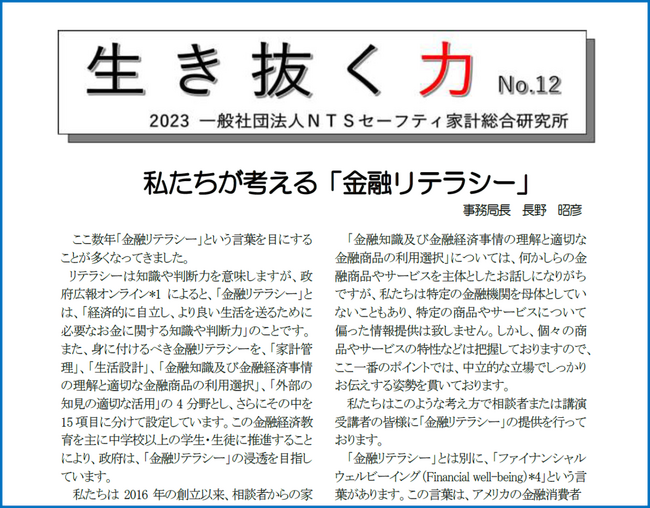 当法人では、これまで「ニュースリリース」としておりました情報発信タイトルを、今回より「生き抜く力」に統一することといたしました。タイトルは変わりますが、今後も私どもが得た「気づき」をもとに、独自の調査と整理を行い一般の方へのお役立ち情報(家計教養)として発信を続けていきたいと思っております。どうぞよろしくお願いいたします。