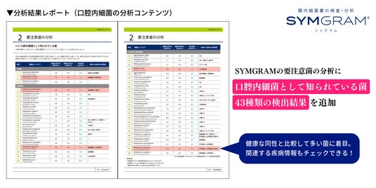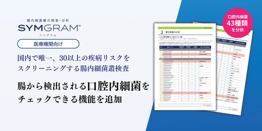 そのような背景のなか、当社が提供する医療機関向けの腸内細菌叢の検査・分析サービス「SYMGRAM(シングラム)」に、腸(便検体)から検出される口腔内細菌をチェックできる機能を追加搭載いたしました。