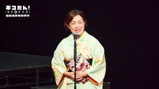 ここで、探偵猫の迷路ソマリ(伊達さゆり)がステージに登場。本作の主題歌をキュートな笑顔とダンスで歌い上げ、会場には大きな手拍子が鳴り響いた。映画やアニメのオープニングを思わせる流れに、会場の熱気も一段と上がったように感じた。そんな大盛り上がりの中、続いて弁士(滝佳保子)が現れ、これまでのシリーズや作品の紹介を軽快なトークで行う。この弁士とは、演説や説明をする役割を担った人物のこと。この作品では、それぞれのキャラクターを端的に紹介したり、物語の補足をしたりする。観客がより物語に入り込みやすいように手助けしてくれるので、初見でも物語を存分に楽しむことができるのだ。