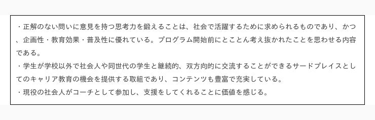 審査員の評価コメントでも、今こそ社会に必要とされる「キャリア探索への取り組み」が高く評価されました。はたらく部の活動は、オンラインセッションに留まりません。オフラインも含めた、第一線で活躍する社会人との継続的なつながりは、プレゼンテーションや自分で目標に向けて試行錯誤したり、チームの仲間と切磋琢磨する経験をしたり、計画を立ててプロジェクトを進めるなどの実践的な経験ができます。