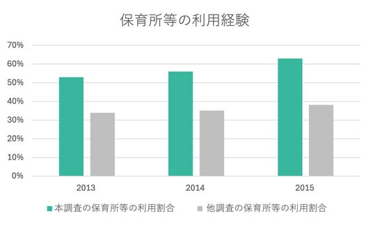 保育所等の利用経験は高い傾向保育所等の利用経験は、他調査よりも利用割合が20ポイント高くなりました(詳細3)。