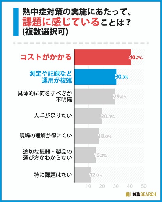 熱中症対策の実施にあたって課題に感じていることを尋ねたところ、1位は「コストがかかる」で40.7%にのぼりました。次いで「測定や記録など運用が複雑」が30.3%、「具体的に何をすべきか不明確」が29.0%と続き、金銭的な負担と実務的なノウハウ不足が二大障壁となっていることが明らかになりました。