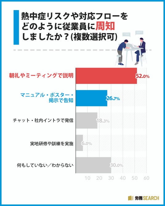 熱中症リスクや対応フローに周知方法について尋ねたところ、1位は「朝礼やミーティングで説明」で52.0%、2位は「何もしていない/わからない」で30.0%、3位は「マニュアル・ポスター・掲示で告知」で26.7%でした。