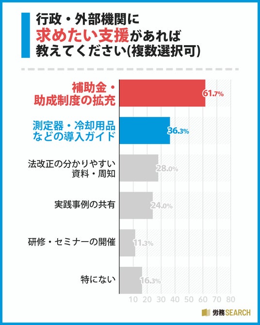 また、義務化された「作業環境のWBGT測定」を強化した企業は14.3%に留まっており、法改正の本質的な部分への対応よりも、まずは着手しやすい既存対策の強化に留まっているという傾向が見て取れます。