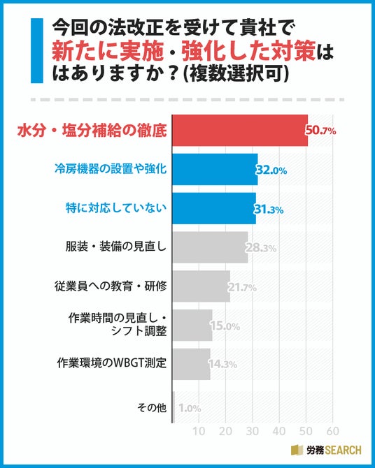 法改正を受けて新たに実施・強化した対策を尋ねたところ、最多は「水分・塩分補給の徹底」で50.7%でした。次いで「冷房機器の設置や強化」(32.0%)、「服装・装備の見直し」(28.3%)と続き、比較的導入しやすく従来からおこなわれてきた対策の延長線上にあるものが上位を占める結果となりました。
