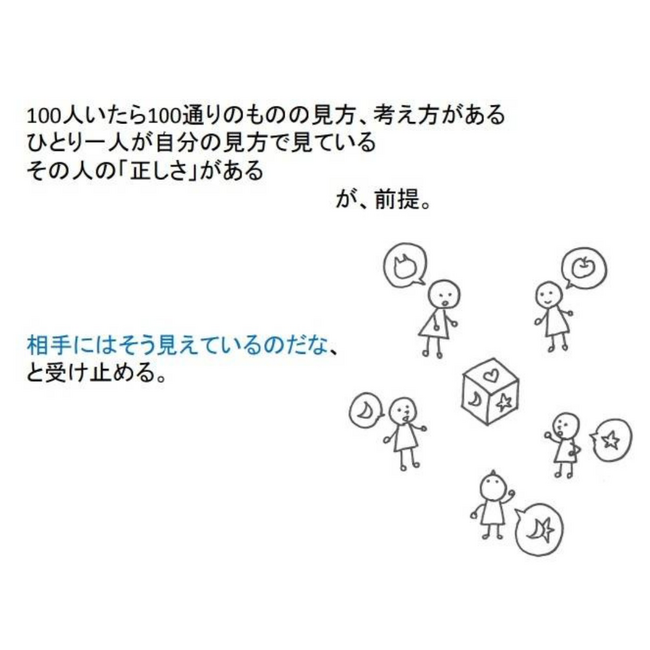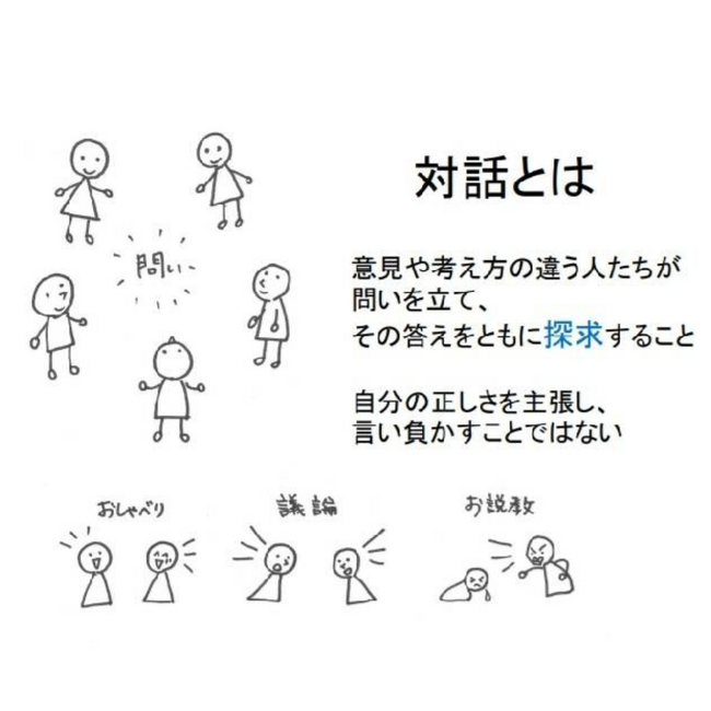 私たちが言う「対話」とは、自分も相手も大切にして、自分の意見をひとまず横に置いて相手を聴き、ともに問いを探究することです。
