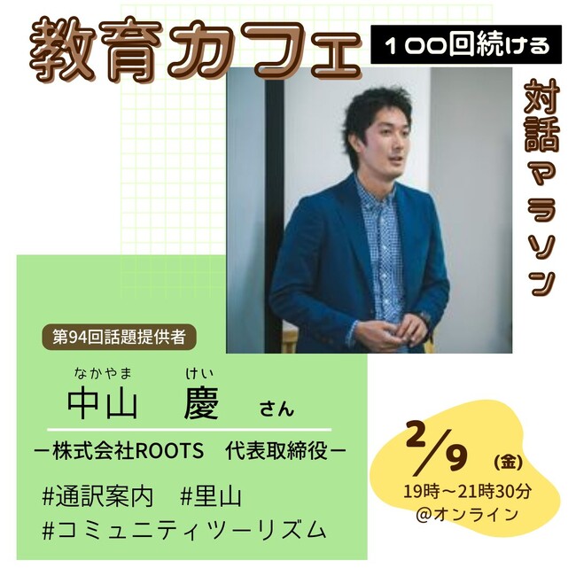 第94回 教育カフェ~100回つづける対話マラソン~ 話題提供者:中山 慶さん 株式会社ROOTS 代表取締役 全国通訳案内士(英語・中国語)、同時通訳者
