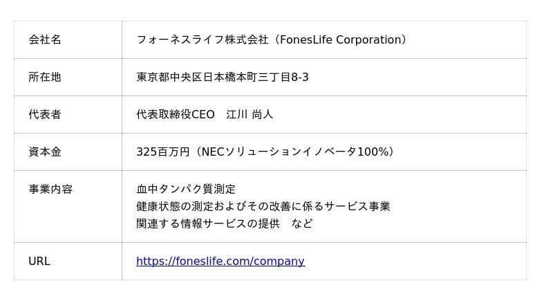 フォーネスライフは、デジタル技術でヘルスケア領域にソリューションを提供するNECソリューションイノベータが100%出資する会社です。米国Standard BioTools(TM)社の血中タンパク質測定技術と、NECグループのビッグデータ解析・先端ICTを用い、認知症などの将来の疾病リスク予測に基づく、一人ひとりに適した生活習慣の改善提案を行うことで、“誰も病気にならない未来”、“誰もが自分らしく生きられる社会”の実現を目指しています。