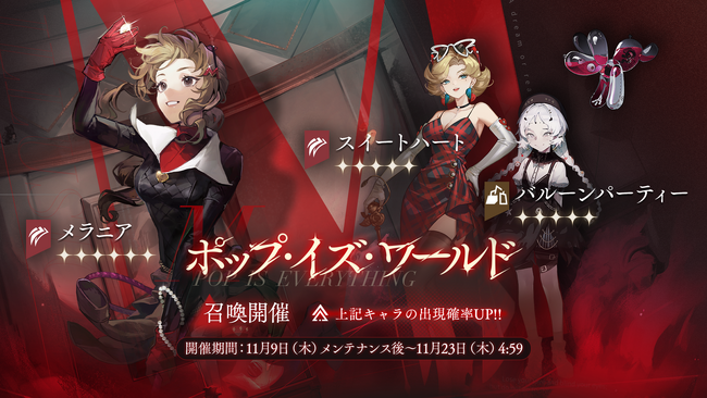 イベント召喚『ポップ・イズ・ワールド』には、イベントストーリーでも活躍する新キャラクター「メラニア」が登場。メラニアをはじめ、バルーンパーティーとスイートハートの出現率も大幅に上昇しますので、この機会にぜひトランクの中に迎えてみてはいかがでしょうか。
