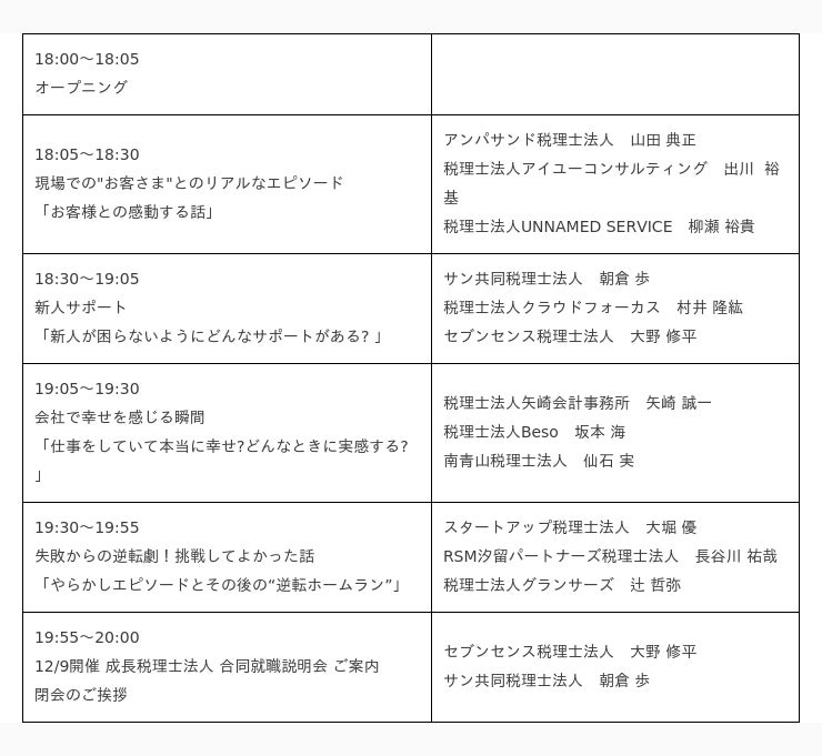 新進気鋭の税理士法人の代表およびリクルーターが、トークテーマに沿って本音で語り合う場となりますので、各事務所の特徴や雰囲気を知る絶好の機会となるでしょう。