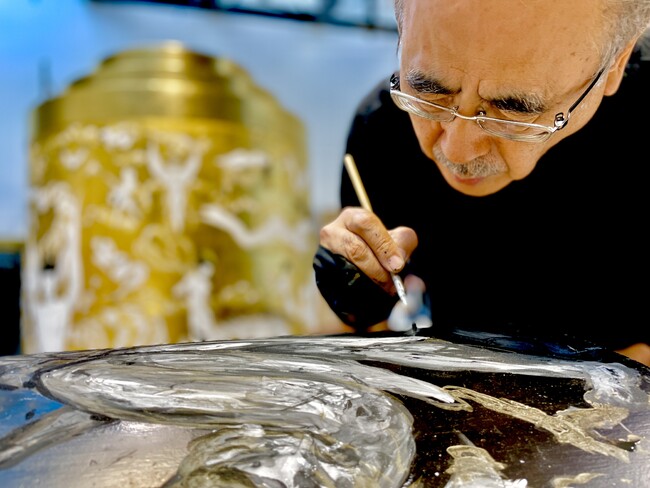 天野喜孝が全長4mの巨大円柱に数多の神々を描いた「金色厨子」。