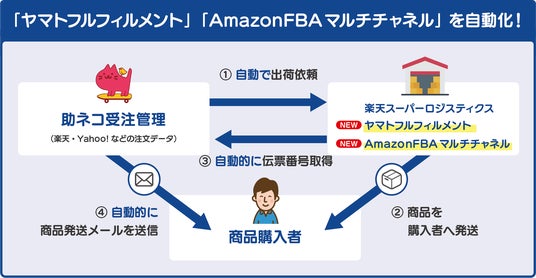 株式会社アクアリーフ(本社:神奈川県平塚市、代表取締役 長谷川 智史)が提供するネットショップ向け業務管理システム「助ネコ(R)EC管理システム(以下、助ネコ)」は、2024年4月11日より、同シリーズの「助ネコ受注管理」において、「ヤマトフルフィルメント(以下、ヤマトFF)」「AmazonFBAマルチチャネルサービス(以下、FBAマルチチャネル)」への自動出荷機能をリリースします。