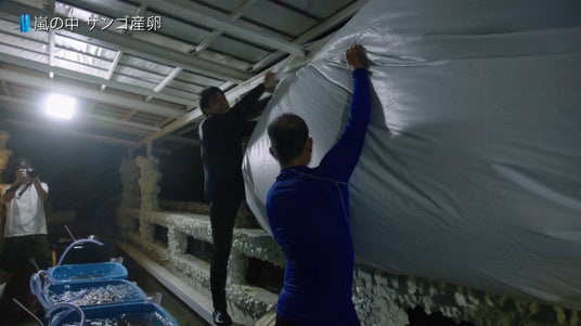 撮影中、産卵の瞬間は何度か訪れましたが、不運にも嵐と重なるタイミングもありました。風と雨の衝撃で卵が割れてしまうリスクがあるため、チームメンバーが一丸となってサンゴを雨風から守る対策を施すなど、懸命に作業する様子も収録されており、自然と向き合う過酷さの一端を垣間見ることができます。