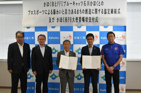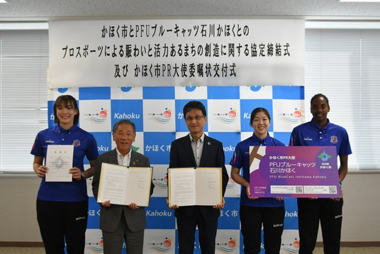 PFUブルーキャッツ石川かほくは、かほく市とのプロスポーツによる賑わいと活力あるまちの創造に関する協定締結式及びかほく市PR大使委嘱状交付式に、代表の蓮池学、GMの寺廻太、選手を代表して、主将の細沼綾選手、大村季色選手、バルデス・メリーサ選手が参加しました。