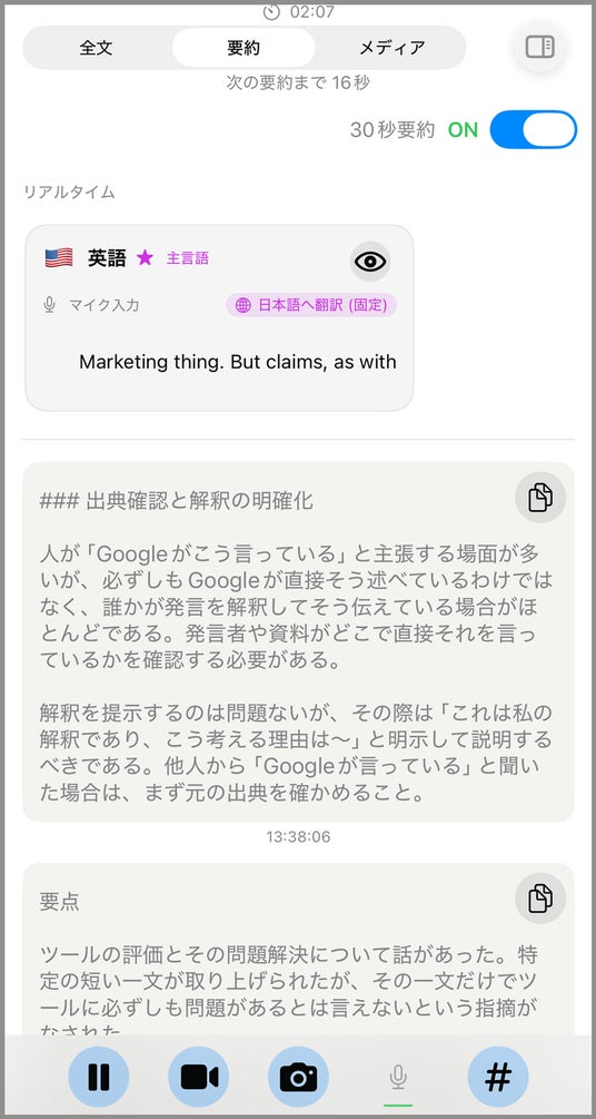 理解を深める要約と質問支援 - 30秒ごとの要約SessionSave は、文字起こしした内容を30秒ごとに要約し、発表の要点を素早く把握できるようにサポートします。講演中の重要ポイントを取りこぼさずに追いかけられるため、後から内容を振り返る際の負担も大幅に軽減されます。