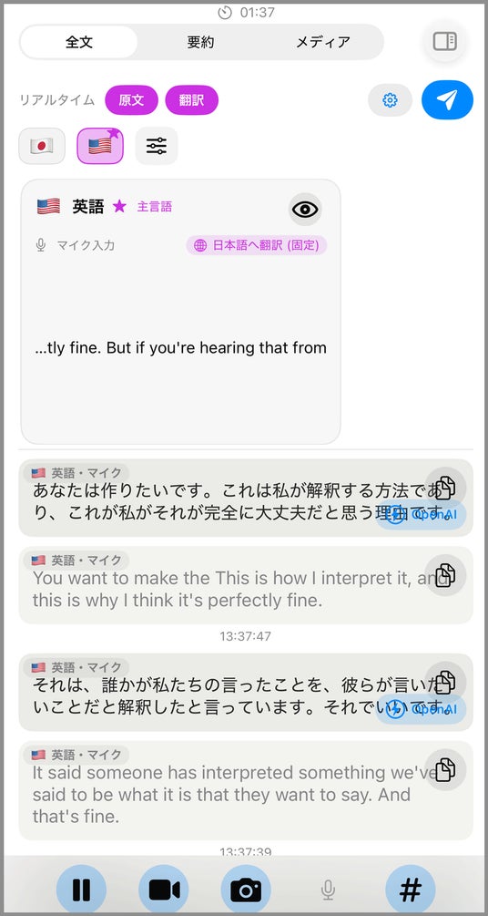 「録音開始」ボタンを押すだけで、原文、日本語訳文、書き起こし文、が表示される