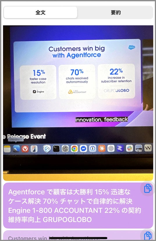 撮影・メディアで学びを強化 - 撮影写真の文字起こしカンファレンスでは、スライドやデモ映像も重要な情報源です。SessionSave では、スライドを撮影して 文字情報を自動で抽出(OCR) したり、講演の模様を 動画として撮影・保存 することができます。さらに、静止画キャプチャ付きHUDにより、スクリーン内容も逃さず残せます。